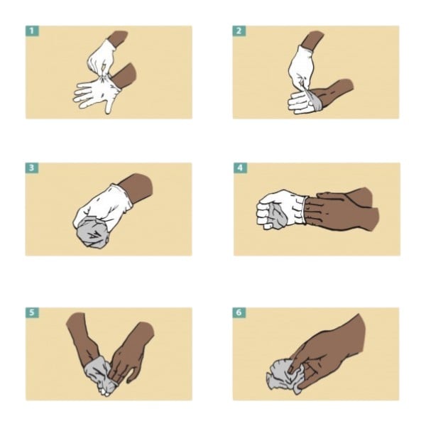 - To remove the second glove, insert your now bare hand inside the glove, using your fingers to push the glove over itself so it is inside out.