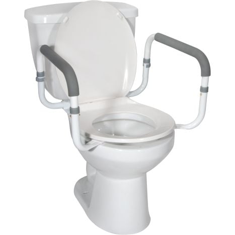 Drive Medical Toilet Safety Rail provides users with added stability while sitting and standing during toilet use. It allows individuals to safely get up and down while reducing the risk of falls and injury. The Drive Toilet Safety Rail installs easily without the need for tools. It features padded handles that are soft to the touch for a maximum comfortable grip. The width of the handles adjusts between 16.5 and 19.5 inches. The Drive Medical White Toilet Safety Rails attaches firmly to the frame of the toilet for ultimate security.