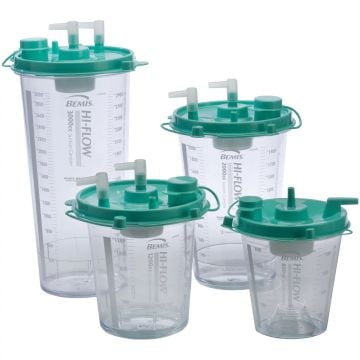 Suction Canisters are fluid collection and tracheostomy accessories that work in tandem with an Aspirator Machine and tubing to hygienically collect aspirated body fluids, such as mucus, from a patient. They are typically made of plastic and are a safe way to lock collected fluids away in a closed system. They also often include measurement lines so caretakers can track the amount of fluid suctioned. These items come in b