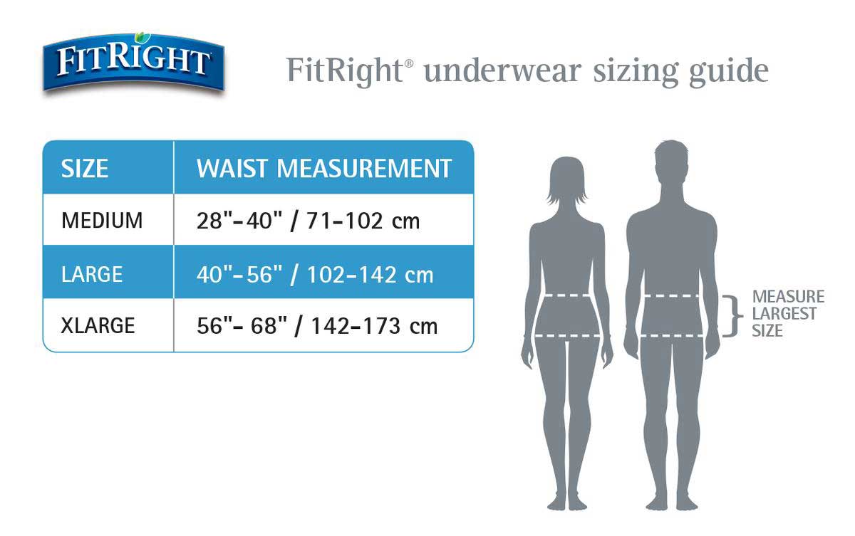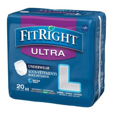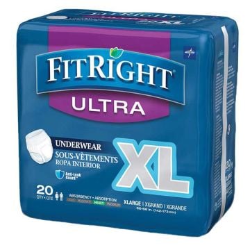 FitRight Ultra Protective Underwear is anatomically designed for a great fit. The underwear is body-contoured and comes with anti-leak guards to help prevent leaks. Soft, non woven fabric is gentle to your skin. An acquisition and dryness layer draws fluid from your skin and stores it in an ultra absorbent core. The core has linear embossing to help distribute fluid throughout the core for better containment without pooling the fluid all in one area. The underwear offers heavy absorbency to provide exceptional dryness.