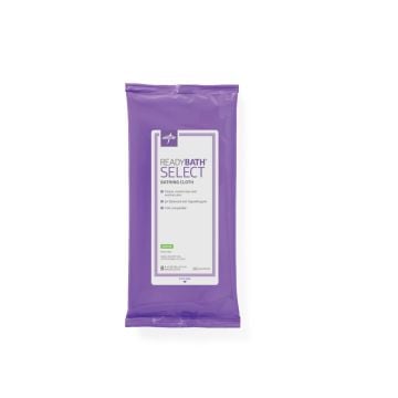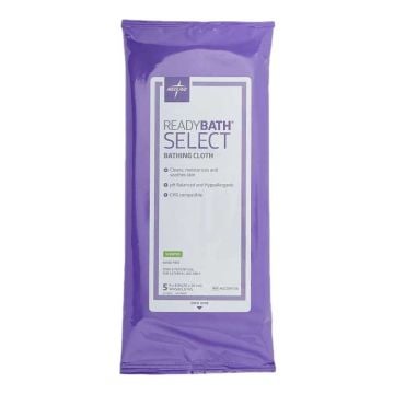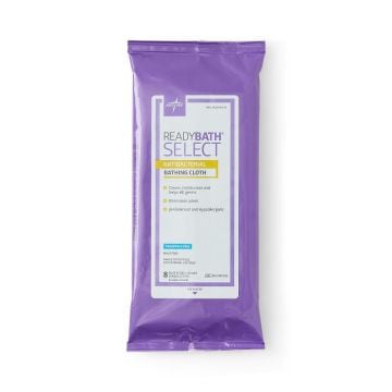 Medline ReadyBath Select Bathing Cloths are medium-weight disposable cloths to assist with personal hygiene needs when the patient is bedridden. The Select line of washcloths are offered in antibacterial and non-antibacterial options and scented and fragrance-free options to accommodate all skin types. All ReadyBath Select Wipes are pre-moistened with a no-rinse hypoallergenic formula that doesn't require additional soaps, lotions, or other equipment. This leaves the patient feeling fresh and clean and increases the caregiver's productivity. Each pack is for single-patient use and contains five or eight wipes to clean each body zone. The packs can be heated for optimal patient comfort or used at room temperature.