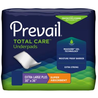 Prevail Total Care Underpads feature a waterproof barrier to protect beds, chairs, and other furniture from incontinence leaks. A layer of fluff wicks away moisture, while MaxSorb Gel absorbs large amounts of moisture and locks away wetness. Prevail Underpads (30x36 Inches) are durable and remain intact even when wet.