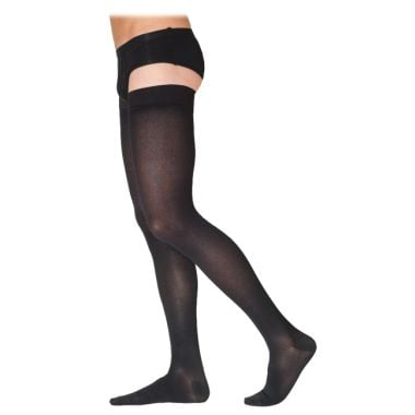 The Sigvaris 860 Select Comfort Men's Thigh High Compression Stockings are designed to help men manage circulatory issues like leg pain and swelling. These stockings provide firm compression of 20-30 mmHg, which can aid in improving blood flow and reducing discomfort. Made with durable double-covered inlay yarn, they offer long-lasting wear. The microfiber material ensures comfort, making them feel less like traditional compression socks.