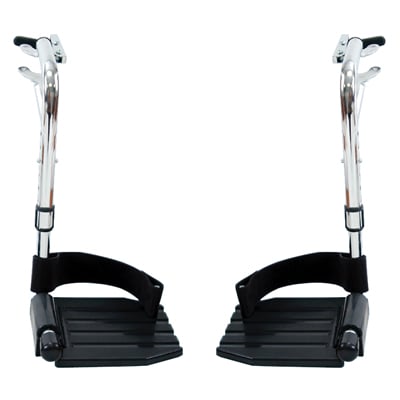 These elevating legres are compatible with most standard wheelchairs. The legrests are padded with soft foam. They allow the user to rest their legs and relieve pressure from the heel of their foot. The elevation feature provides additional user comfort.